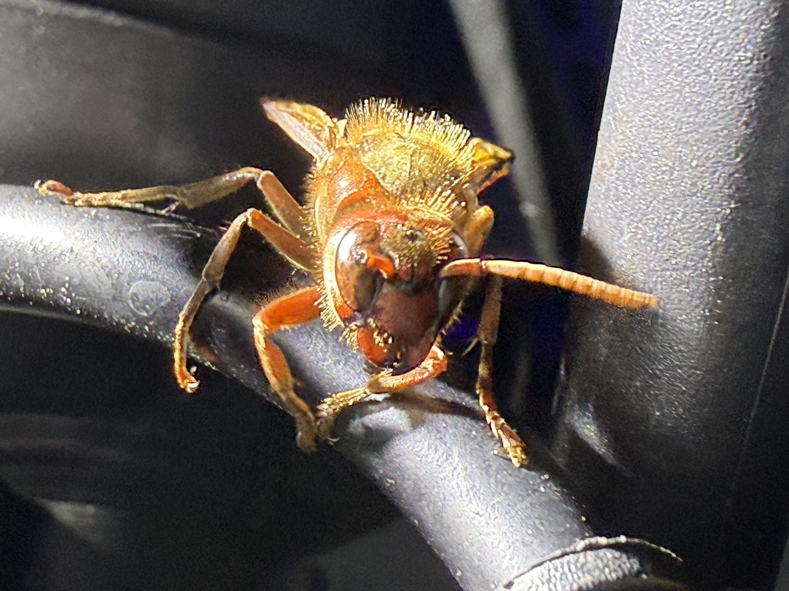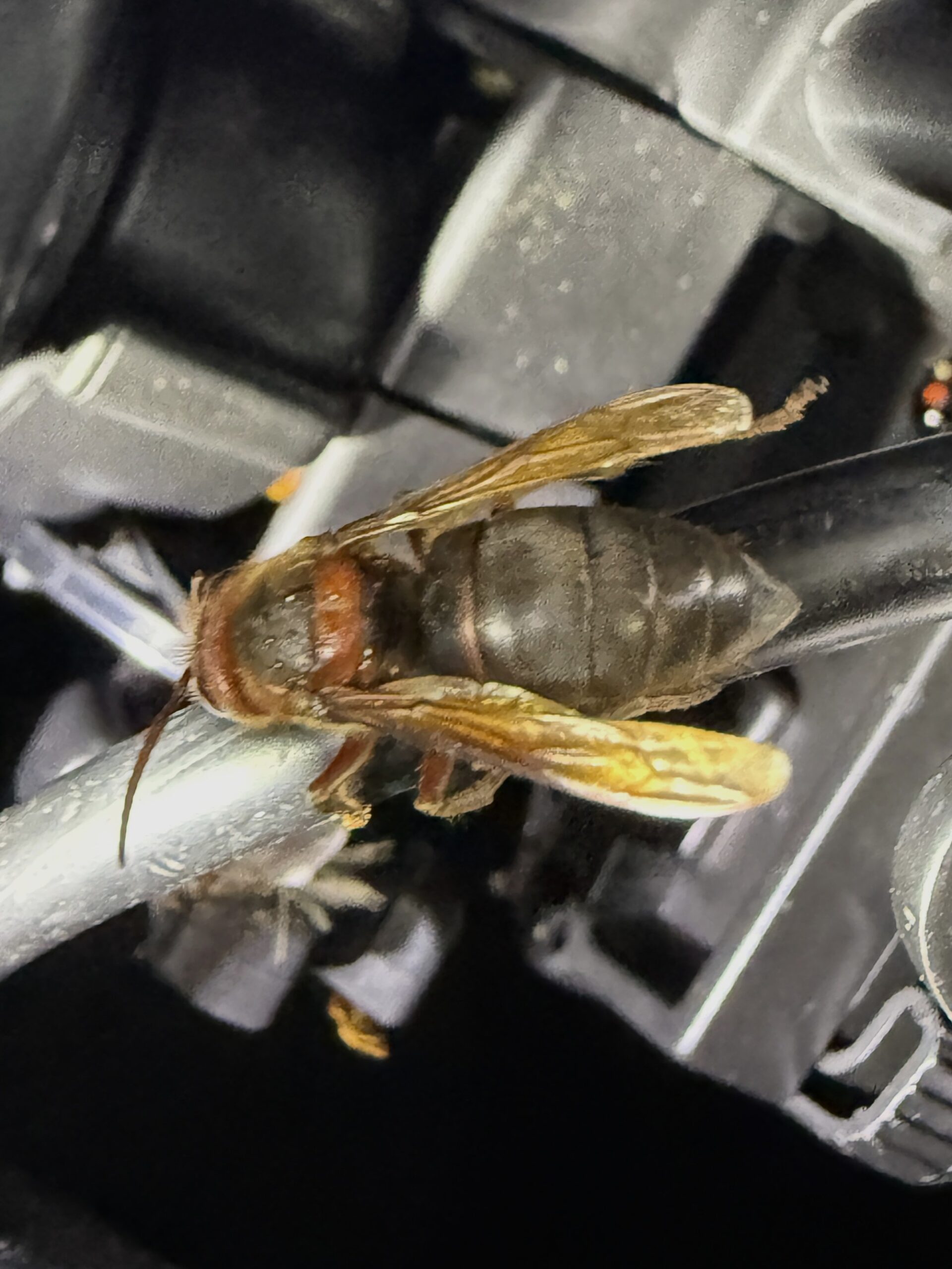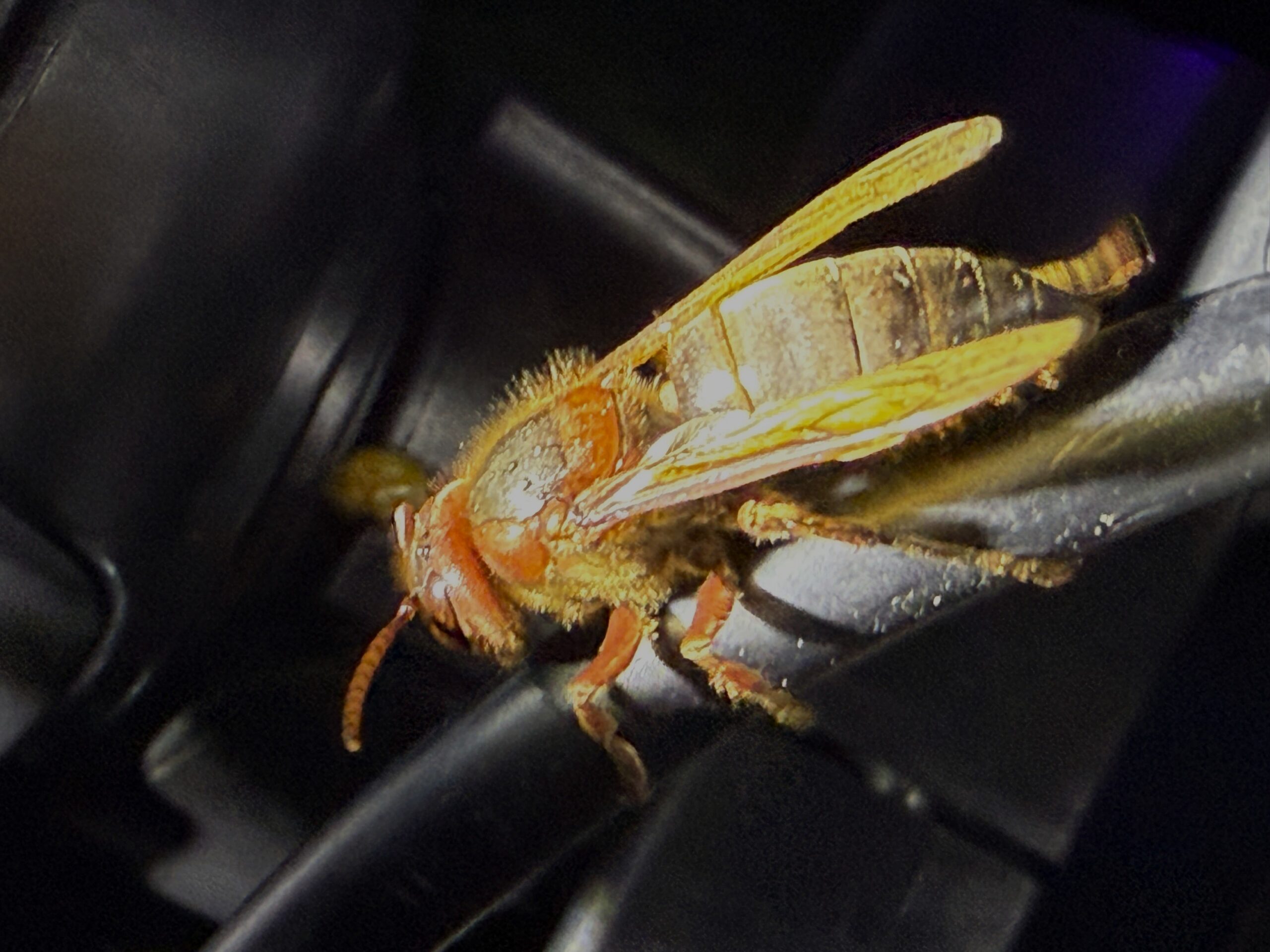 2025年 兵庫県但馬地区の標高1000m付近の山中にて、ライトトラップに中型サイズの蜂が飛来、最初は気にしていませんでしたが、同行させて頂いていた丹波の藤井さんが希少種であることに気づき撮影、チャイロスズメバイとのこと、スズメバチとは思えない暗いカラーです。他のスズメバチの巣を襲うとの事でした。