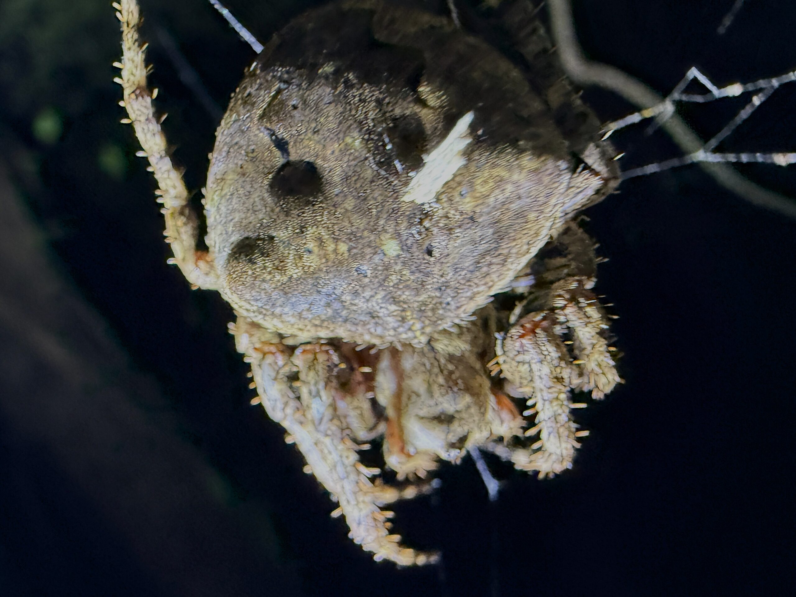 オニグモ クモ 2025.09.252025.10.06 2025年 みのりの会三ノ京さんの案内でやっさんと請島の森に入りました。蜘蛛の巣だらけなのですが、オオジョロウグモとこのオニグモが非常に多く、特にこのオニグモは30mm程度は十分ある大きさだけでなく、広く、分厚く、重量感を感じるを感じるくもでした。真っ暗な中ですので、懐中電灯の光だけで、よく取れてませんが印象の強い蜘蛛です。 分布:北海道~琉球列島 体長:20mm~30mm