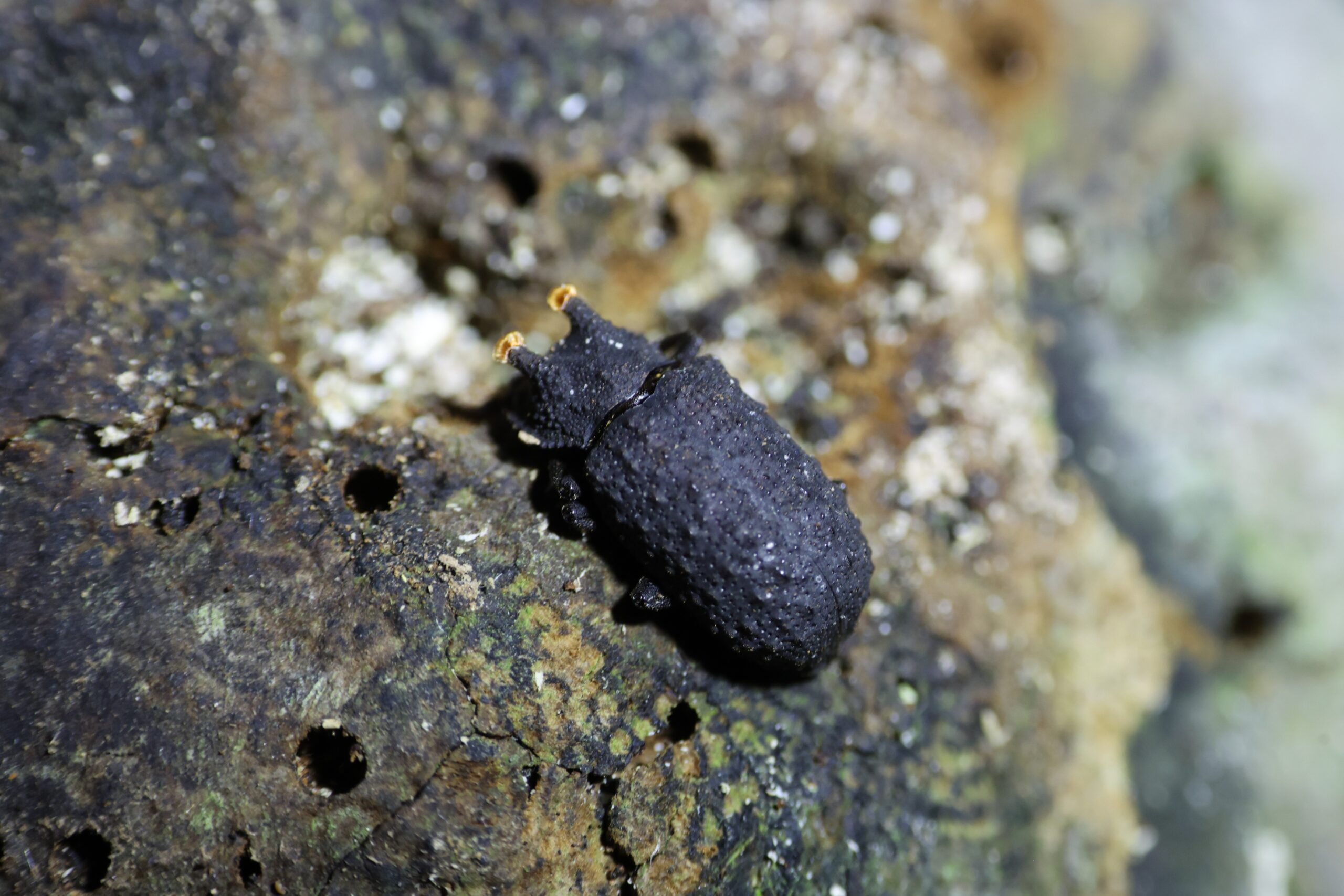2025年 栃木のコルリクワガタやハムシの専門知識を有しておられる遠藤さんが栃木県日光市川俣で採集され、ブリードされたものを送って頂き撮影、オスの面白い独特の形状に感動を覚える個体です。サルノコシカケ類に寄生するようです。