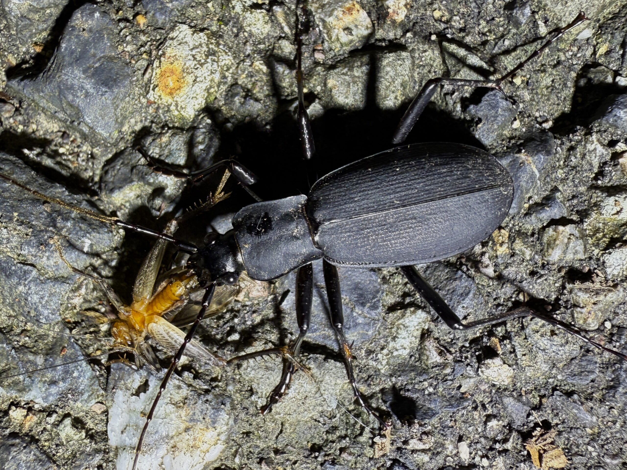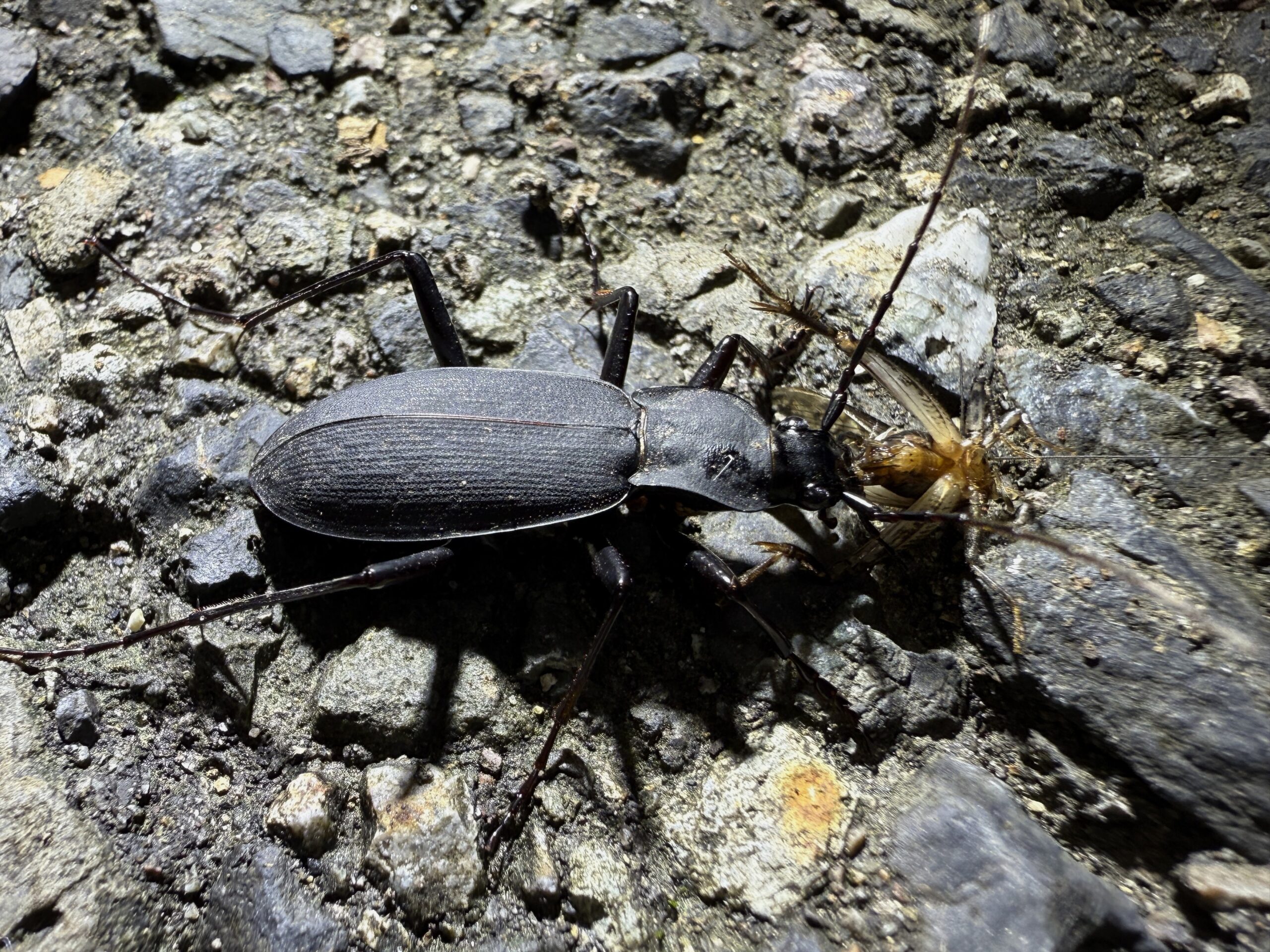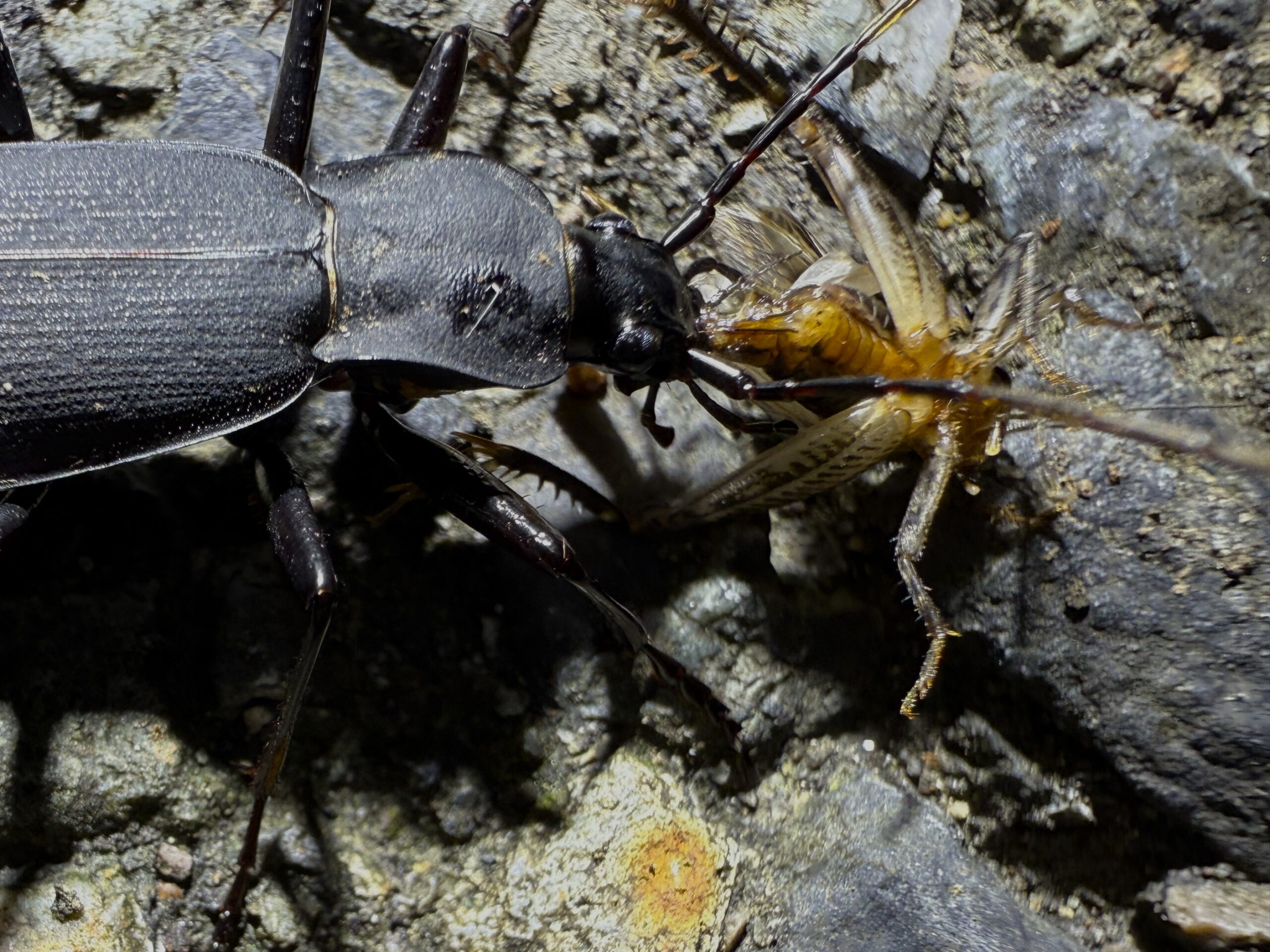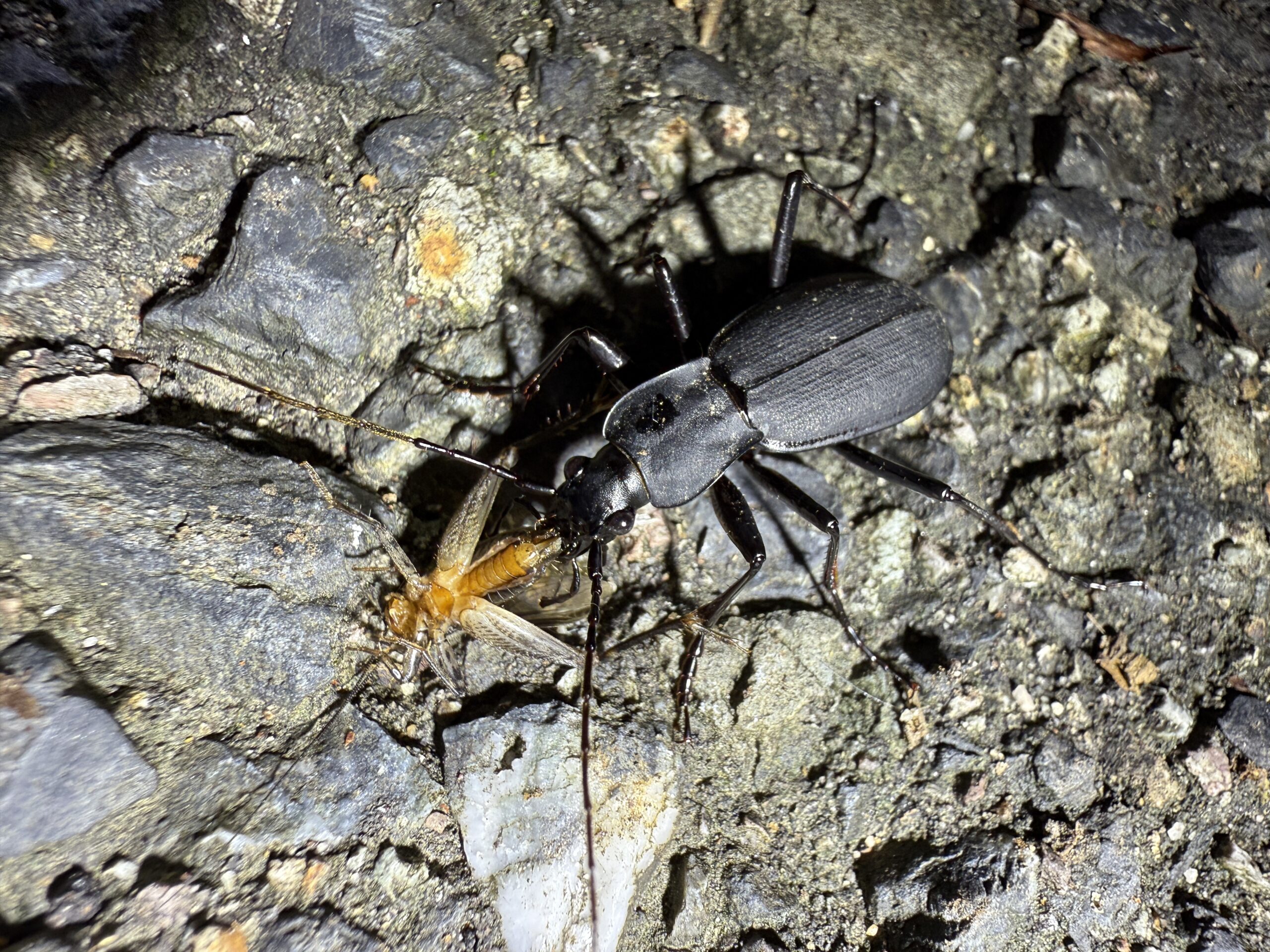 2025年 兵庫県但馬地区の標高1000m付近の山中にて、ライトトラップ中に蛾などを捕食に数匹がやってきた。人が捕食中の昆虫に触れても、取られまいと噛んだまま逃げる強者です。